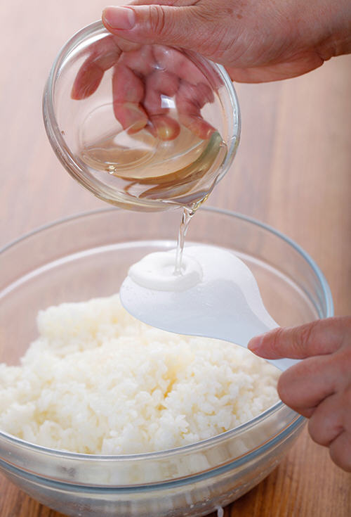 3、将煮好的米饭,迅速翻拌一下,再倒入容器中,淋上作法1的寿司醋,以平行角度,用切拌的方式,动作要轻柔迅速,让醋和白饭充分融合。