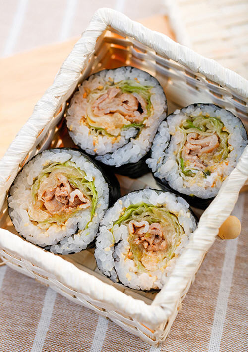 海苔片 1片、寿司醋饭 适量、五花肉片 120公克、韩式泡菜 100公克、美生菜 适量、白芝麻 少许
