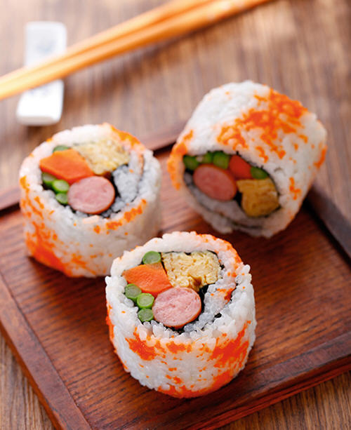 海苔片 1片、寿司醋饭 适量、鱼卵 少许、西式香肠 1条、芦笋 4条、红萝卜煮 1小条、厚蛋烧 1条