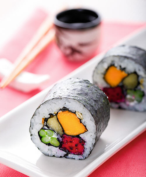 海苔片 3片、寿司饭 适量、芦笋 适量、红火龙果 1/2个、爱文芒果 1/2个、奇异果(金黄色)1颗