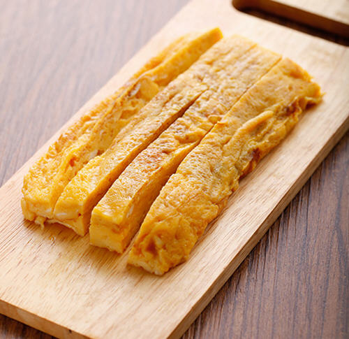 3、空出来的锅面重新涂油,倒入适量蛋液,并稍微掀起锅边的半熟蛋皮,让蛋汁流入下方确实布满整个锅面,然后煎至半熟时,再次对折移至锅边,重复所有步骤至所有蛋液用完,煎好的厚蛋可稍微整型,待凉后切条备用。