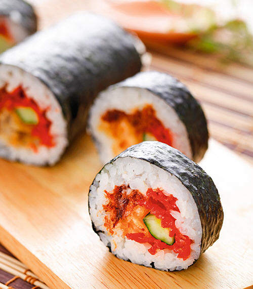 2、取寿司竹帘,铺上海苔片,铺满适量寿司醋饭(前端预留2公分),并略紧压,先挤上适量的美奶滋,再依序摆上肉松、红色豆枝、酥脆油条,卷起呈圆柱状寿司卷,食用时切粗段即可。