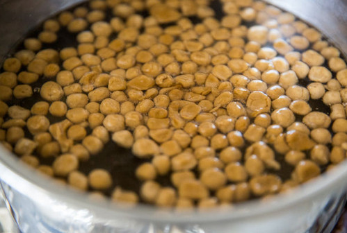 3、将粉圆冲冷水洗掉黏液,再放入锅中,加入1杯水和黑糖,外锅加1杯水至跳起,再闷30分钟。
