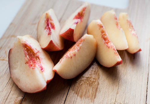 2、将水蜜桃切片、优格、牛奶、糖用手持电动搅拌棒或果汁机搅打均匀即可。