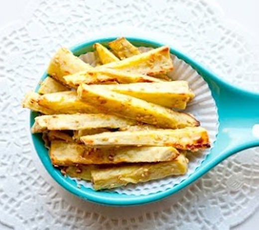 1、将中型地瓜切成条状,并撒上橄榄油轻轻搅拌,使每根薯条都均匀沾到橄榄油。