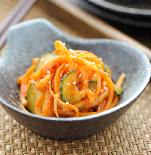 调料:辣椒酱2汤匙(30克),白醋1汤匙(15ml),糖3茶匙(15克),盐1茶匙(5克),白芝麻少许