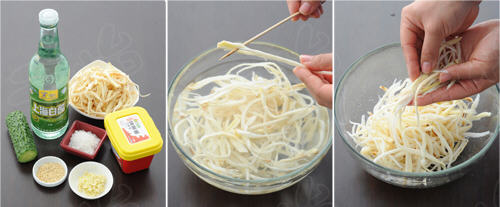 1、桔梗丝洗净后浸泡在水中,变软后,用一根竹签从桔梗的尾部插入,然后撕成细条。把所有的桔梗都撕成粗细均匀的丝即可。