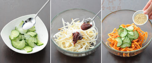 2、将浸泡在水中的桔梗沥干水份,撒入盐(3克),充分揉搓,直到尝过后,没有很明显的涩味即可。然后攥干水份,备用。