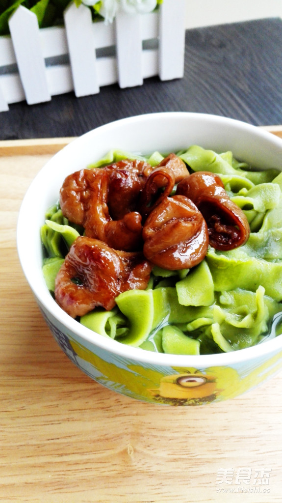 一人食,只有做面条吃最方便啦,用菠菜汁和面,出来的面条翠绿翠绿的,很有食欲哦 主料 菠菜150克 面粉200克 肥肠50克 辅料 清水适量 盐适量 鸡精少许 翡翠肥肠面的做法 1.菠菜用原汁机榨汁 2.面条机内放入面粉,选择筋道面,进水孔放菠菜汁 3.15分钟后出面完成 4.锅内放水,大火烧开 5.放入面条,盖锅盖,大火烧开,放入适量盐 6.煮至面熟后捞出,放入碗中,放入红烧肥肠食用 烹饪技巧 绿色上色最好的就是菠菜汁啦,黄瓜汁做的面条一煮就没颜色喽 点击查看更多:手擀面的做法大全