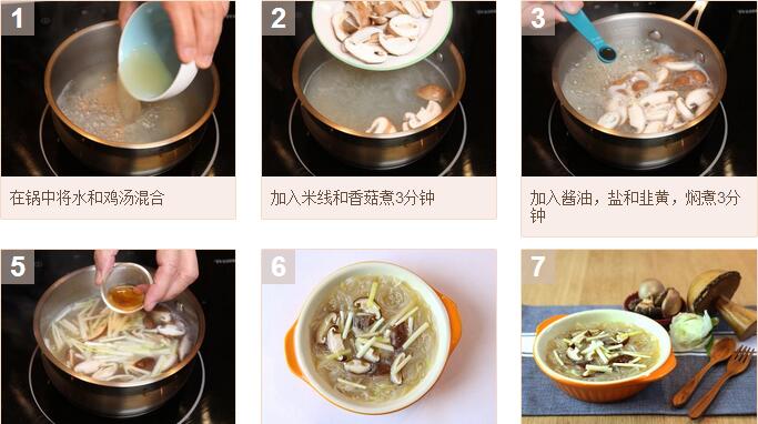 香菇麻油米线羹的材料:香菇6朵,韭黄80克,米线100克,鸡汤250mL,水500mL,酱油1汤匙,芝麻油1汤匙,盐1/4茶匙 芡汁:生粉1汤匙,水20mL 香菇麻油米线羹的做法: 1. 香菇切片,韭黄切成约2cm长的段。 2. 在锅中将水和鸡汤混合,加入米线和香菇煮3分钟。 3. 加入酱油,盐和韭黄,焖煮3分钟。 4. 再倒入芡汁不停搅拌,当汤汁变得浓稠后,淋上适量芝麻油就可以了。