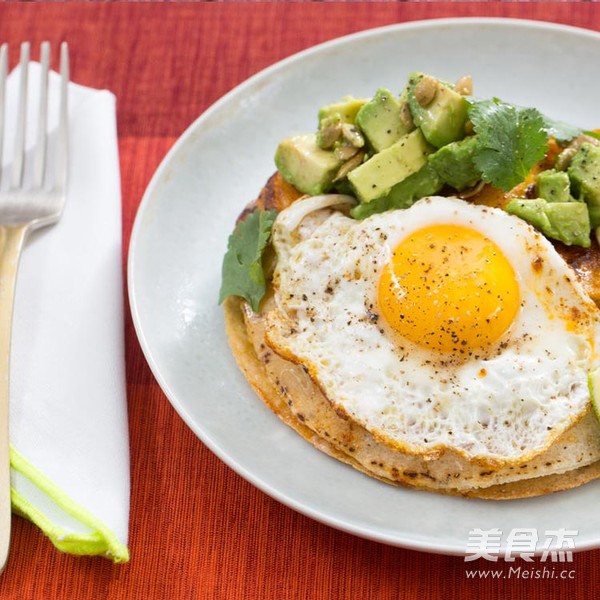 6.在牛油果粒中放少许盐和胡椒粉调味完成牛油果沙拉。煎一个荷包蛋(冷油下锅小火煎可以得到流黄蛋),和牛油果沙拉一起放在玉米饼顶层。撒上香菜装饰。开吃吧!