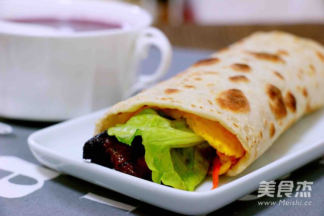 9. 然后依次放入蛋饼,胡萝卜丝,生菜叶,鸡腿肉就可卷起饼了!这里胡萝卜丝可以放平底锅稍煎一下,或直接生的都行!我煎了一下,不是说加了油的熟胡萝卜更营养么!
