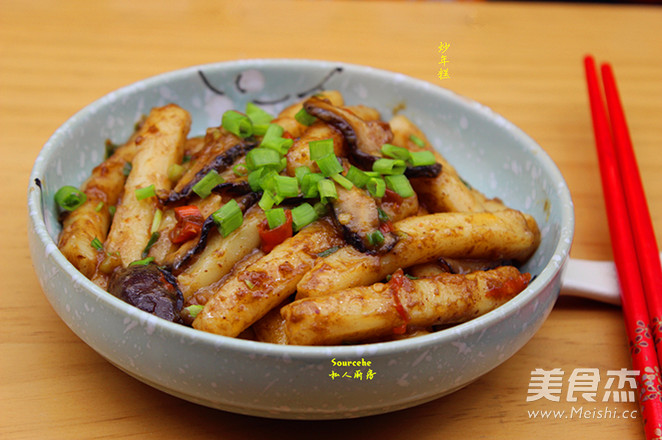 8.炒熟的年糕放盐、葱,炒均起锅即可;