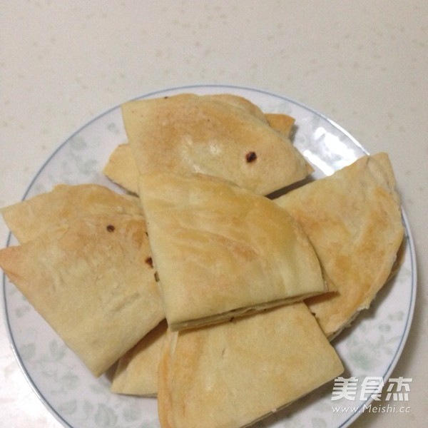13.把另外一张饼盖上面,同样的涂上葱花再盖一张饼,三层饼共做了两张