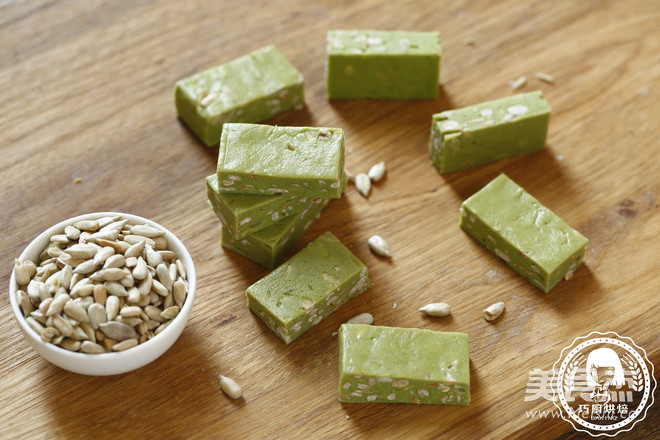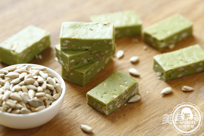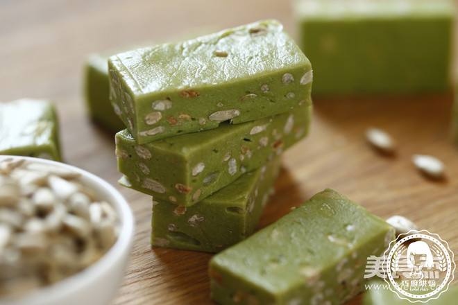 “炒瓜子,炒花生,炒完之后给小童”,过年的瓜子就像过年的春联一样,那么具有代表性。如果厌倦了单纯的嗑瓜子,那就让它派上别的用场吧!谁也没规定牛轧糖不许用瓜子。和抹茶的清香搭配,也许会给浓郁的年味增添一抹清新之感。