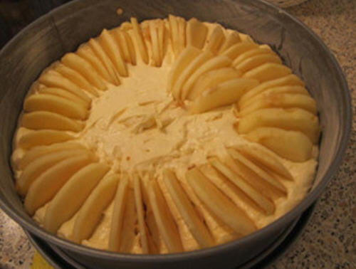 10、苹果片不用下压,只要插入蛋糕糊中,约四分之一就可。在烘焙中,因为苹果片有重量,加上蛋糕糊中泡打粉的作用,就可以出现苹果片镶入蛋糕的感觉。