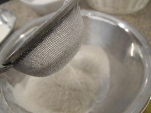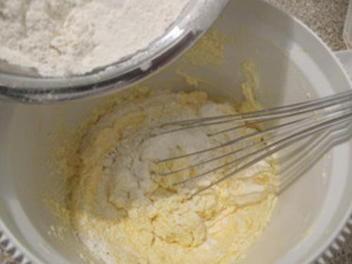 2、烤模仔细薄薄抹油,撒上面粉。不可使用植物油和液态油。一定使用奶油,或是乳玛琳。 所有干粉类:面粉,玉米面粉,泡打粉搅拌混合后,过筛后备用。
