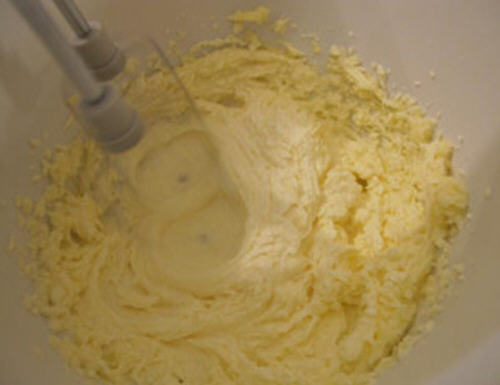 4、奶油以电动搅拌机慢速略为打发,多次加入糖,打发直到糖与奶油融合。