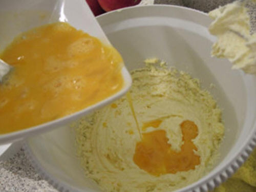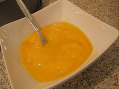 5、分多次加入蛋汁,每次加入都仔细搅拌。