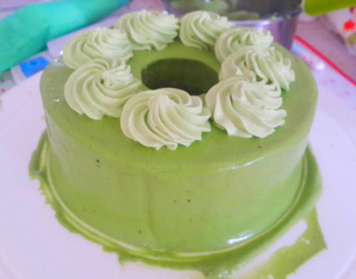 13、抹好面后,在剩余的抹茶奶油中再加100ML,搅打后装入裱花袋装饰一下即可。面抹得很平,移入盘子的时候又蹭到了,所以成品的面坑坑洼洼。
