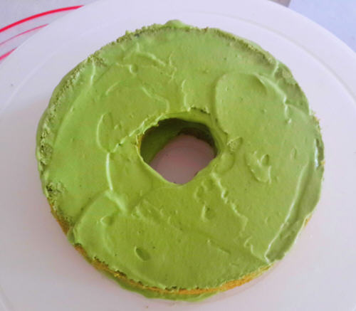 这款小清新抹茶戚风蛋糕色泽纯绿,看上去就是一款健康的绿色食品哟。虽然表面不怎么好看,但这是因为温度太高了,蛋糕拿出来拍照就被热熔了,坚挺的奶油花一下矮了半截,加上手残星人,也只能如此了。