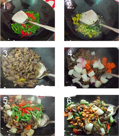 4、热锅冷油,烧五成热,下葱姜泡椒,炒一下,倒入鸡杂,糖,十三香,一起翻炒出香味,鸡杂水分炒出。放点料酒,生抽,翻匀,放洋葱胡萝卜,炒断生,调入盐,把辣椒倒入,翻炒到汤汁变干放点香醋。淋香油,放味精。翻炒均匀即可在出锅放腰果,也可以装好盘再撒。 怎么做好吃