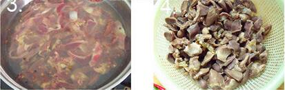 1、鸡胗切片,鸡心一剖二,坐锅倒水水中放花椒煮开,倒入鸡胗鸡心,煮开,放一点料酒,不盖锅盖,煮几分钟,煮好的锅里有很多脏东西,要冲洗干净,沥干备用。