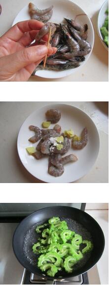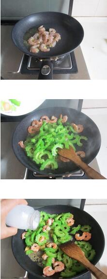 3.热锅凉油, 下入刚腌制好的虾仁翻炒;虾仁变为红色后下入刚焯过水的苦瓜;翻炒几下后加入盐等调味料;最后加入水淀粉勾薄芡即可;