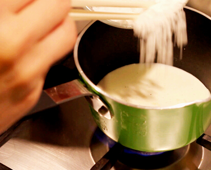 3.将混合液煮下,加入一半糖粉,煮到快沸腾的状态时熄火