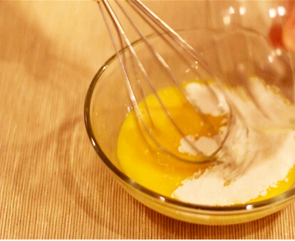 4.蛋黄搅匀,注意不要打出气泡,加入剩下的糖粉,搅匀,沿着边慢慢倒入煮好的混合液