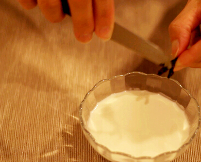 香草烤布丁的材料:淡奶油35g,牛奶15g,糖粉30g,蛋黄4个,香草1/4根,