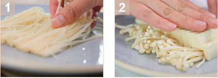 1.金针菇洗净去头,沥干水分摆在盘底,将嫩豆腐切片扑在金针菇上