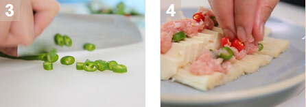 3.将拌匀后的肉末在豆腐上浇上豉油,隔水蒸8-9分钟后出锅