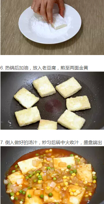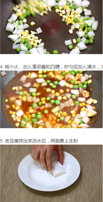 秘制浇汁豆腐的材料:老豆腐/北豆腐200g,玉米50g,豌豆30g,洋葱80g,番茄酱5茶匙,生粉,植物油,盐1/8茶匙,白糖1茶匙