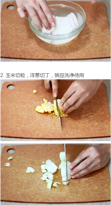 1.老豆腐切小片,放到盐水里浸泡一会,去除腥味,玉米切粒,洋葱切丁,豌豆洗净待用