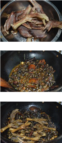 3.起油锅,放上香料包,大葱段,姜蒜,炒香后倒入夹好的田螺,翻炒几分钟后加入笋,盐(多些,因为加水后就会变淡),蚝油翻炒。加入少许水煲一下。翻炒后加入鸭脚进行翻炒,炒好又加入少许水翻炒,如果太淡就继续加入耗油或盐,有点咸就对了,加入少许白砂糖,豆鼓,腐乳,紫苏翻炒,煲3分钟左右。