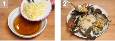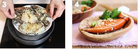3. 螃蟹洗净斩段,然后淋上调味料,隔水高火蒸8分钟,最后加上葱花和香菜出锅。
