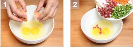 2. 打蛋,加入准备好的长豆,红萝卜和腊肠。