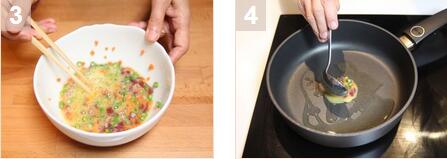 4. 在油镬内中火加热适量油。加入一大匙鸡蛋混合物,煎至双面金黄,每面约需时2分钟。
