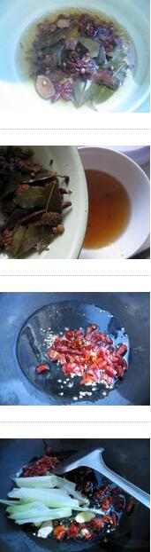 4. 把干辣椒剪段,八角、三奈、桂皮、小茴香、草果、丁香、砂仁、花椒、豆蔻和香叶等用清水稍泡