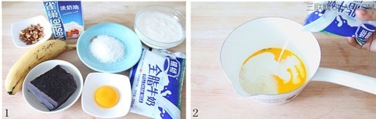材料:香蕉一根约70克,酸奶50克,牛奶60克,淡奶油40克,蛋黄1个,细砂糖20克,花生碎适量,巧克力适量。