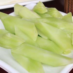 取用6月分的葛苣加工,削去皮和老筋,以净莴苣每10公斤配用食盐1800克为列。初制时,将莴苣顺序码放缸内,先用800克食盐分层撒腌,每天翻动2次,扬汤散热,使其盐粒融化,并注意避免莴苣折断。第3天起再用盐1000克分层复腌,每隔两天翻动互次,连翻5次后,再用石块压紧封缸贮存,前后共腌制20天即成浅黄色、脆嫩的食品。