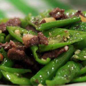 牛肉富含蛋白质和血红素铁,能提高机体抗病能力,有利于生长发育。青椒是维生素C含量非常高的蔬菜之一,其维生素C 的含量比茄子、番茄都高,而维生素C有助于将三价铁还原成二价铁,更利于铁的吸收。这两种食物搭配,口感协调,色泽漂亮,补血又补维生素C,能够起到补中益气,滋养脾胃,强健筋骨,止渴止涎的功效,适宜于气短体虚、筋骨酸软、贫血久病及面黄目眩之人食用。