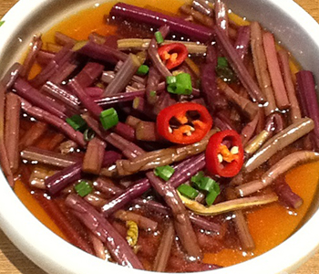 将蒜泥放在蕨菜的上面,另锅下油爆香紫天椒,淋在蕨菜上,凉拌蕨菜即成。