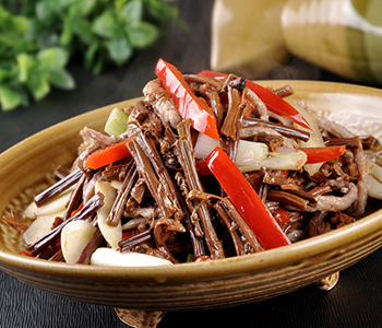 蕨菜鲜嫩细软,余味悠长,最重要的是营养价值高,享有"山珍之王"的美誉。蕨菜含蛋白质、脂肪、碳水化合物、维生素C、萝卜素、钙、磷、钾,还含有麦角甾醇、胆碱、甙类、鞣酸等成分。对细菌有一定的抑制作用,能清热解毒。可以扩张管,降低压,还可以止泻利尿。