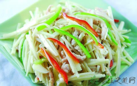材料:猪肉茭白、油、盐、料酒、淀粉、姜丝、生抽、鸡精各适量。