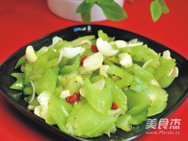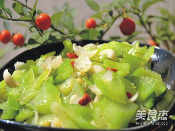 5.炒锅加油烧七成热,加入焯好的西芹煸炒