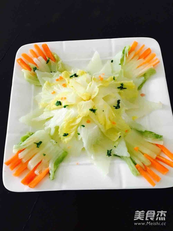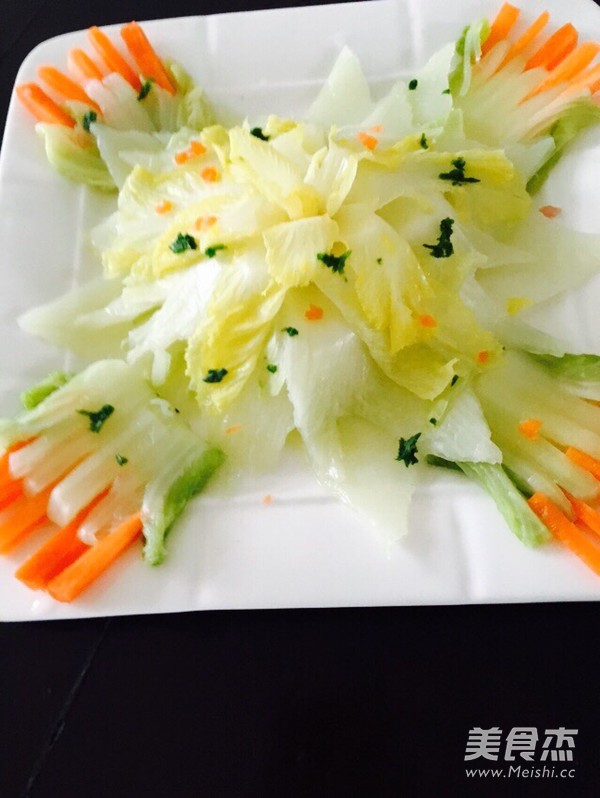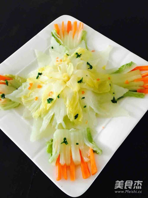 6.煮好的白菜三折,再用刀划五下,再将萝卜段放入做成佛手