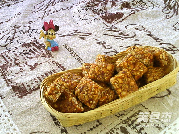 如果没有温度计可以将糖浆滴入冷水中,看糖是否变脆。 花生芝麻可以换成其他坚果。 切糖时需趁热,否则不宜成型。 糖块大小可以随自己喜好任意调整。