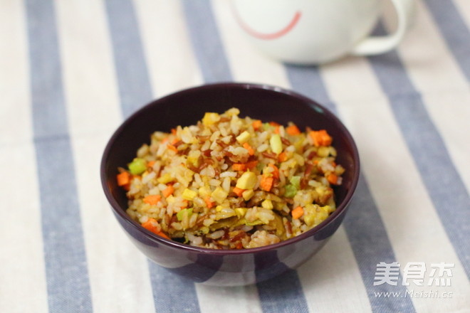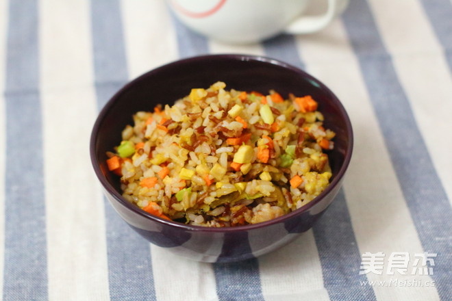 4.将清净切小丁的红萝卜、芹菜、杏鲍菇、少许油均匀撒在米饭上